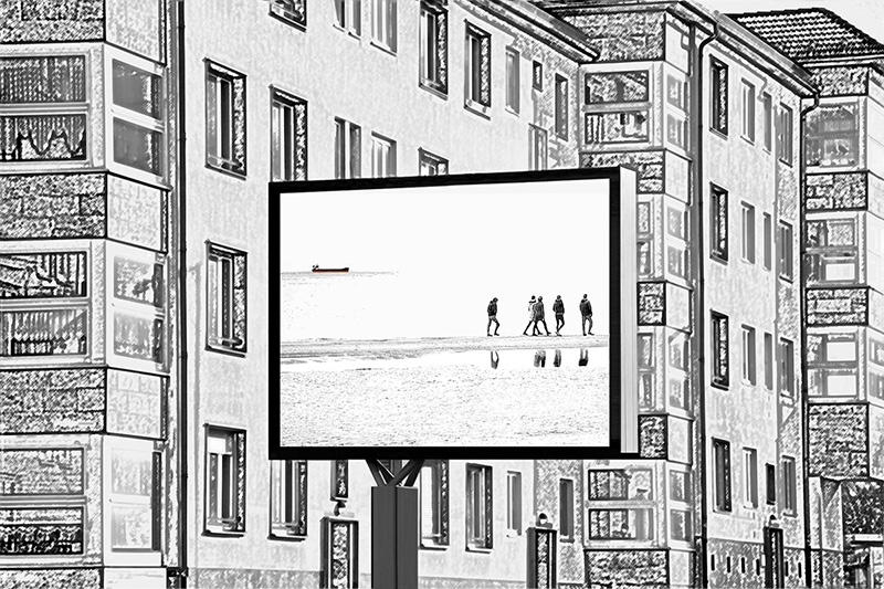 Das Themenfoto zu dieser Serie heißt ebenfalls Hoffnung. Es zeigt einen kompakten Wohnblock mit einem City Light Board davor. In dessen großer Werbefläche fand der Traum von einem gemeinsamen Strandspaziergang seinen Platz.